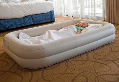 The bed itself comes with a hand pump that looks like it would take a long time to pump, but it really doesn’t. There are two parts to inflant; the main mattress and the wall which creates a bit of a barrier around the mattress so that they don’t roll out.