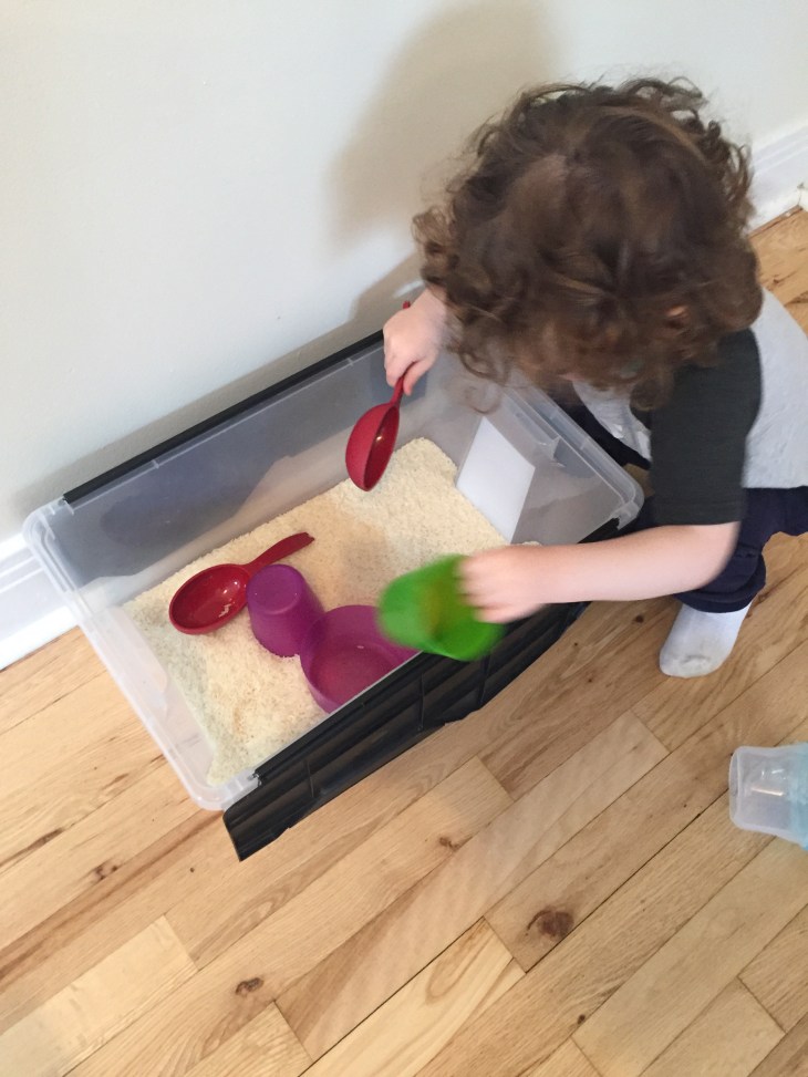 Our first activity was the rice sensory “sand table”. Pour rice into bin. Toss in some pitchers, cups, measuring spoons and then let them have at it! Total hit! Got a solid 20 Minutes of play on this one.