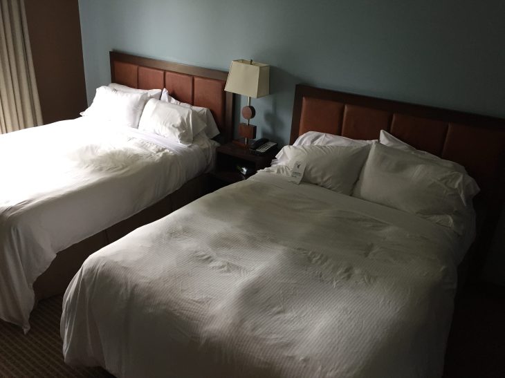 With a little elbow grease, we made the room much bigger by strategically placing the hotel room furniture. As you can see above, the space created when the beds were moved, we had lots of room for both kids and their sleeping space.