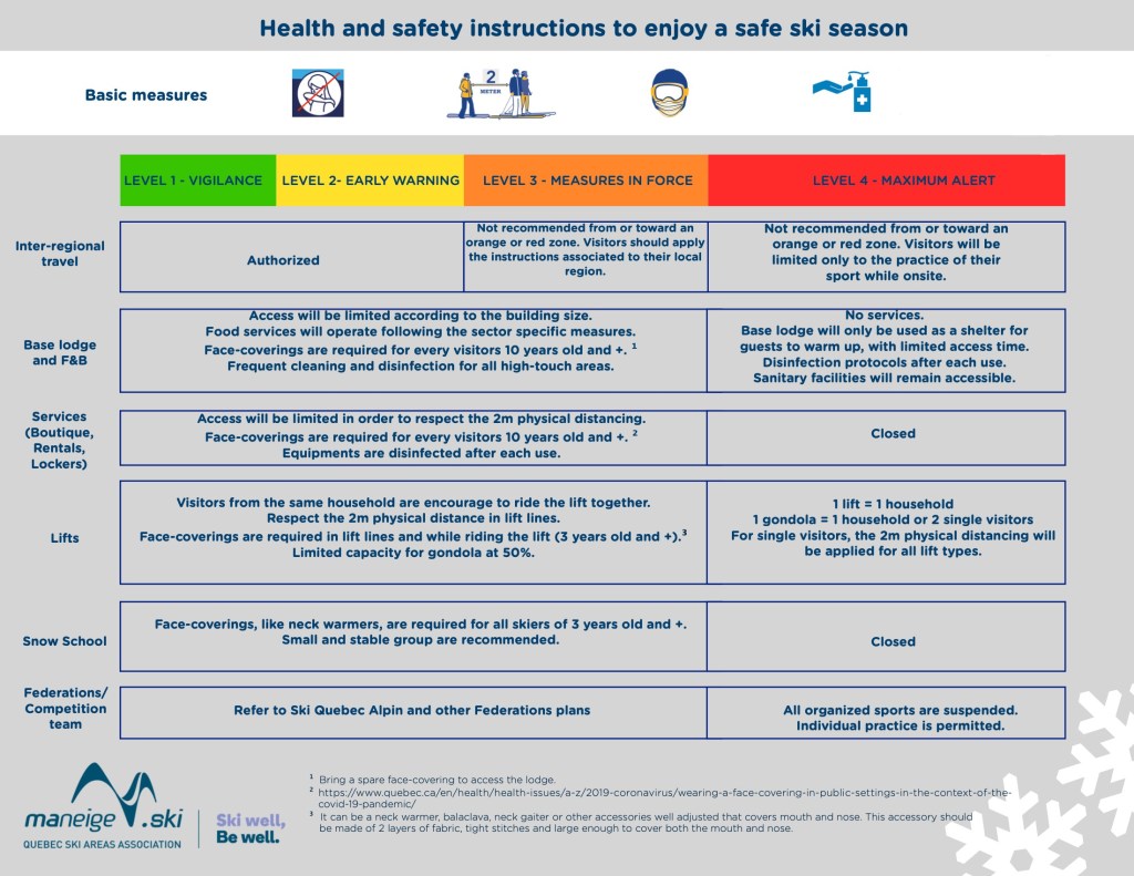 The current rules on ski school in Quebec are they can continue as long as the mountain itself is in a green, yellow, or orange zone. In these coloured zones, ski school can continue as normal as long as the child is wearing a face covering (like a neck warmer).