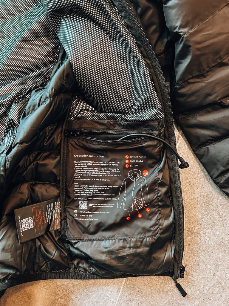Receiving the Jacket: Upon receiving my Venustas heated jacket, I was immediately impressed by the sleek packaging and attention to detail. Inside the box, along with the jacket itself, was a rechargeable battery pack, charging cable, and clear instructions on how to use the heating features effectively. The removable batter pack slips into the inside pocket where a sleek cord allows connects right to the battery pack. (Pro tip: charge the battery before use)