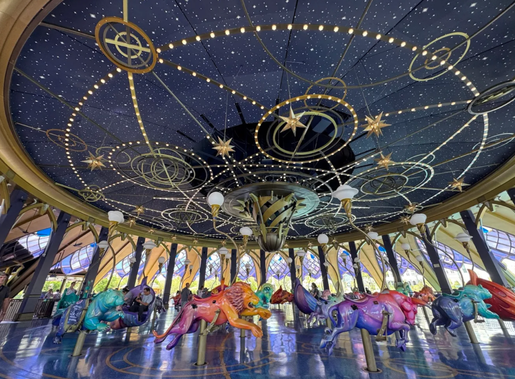 You might be tempted to walk past the carousel, thinking it’s just for toddlers. Don’t make that mistake. Located in the heart of Celestial Park, the Constellation Carousel is a masterclass in theme park design that actually kept my kids enageded. My 9 year old was pumped to see there was a dragon he could sit on!